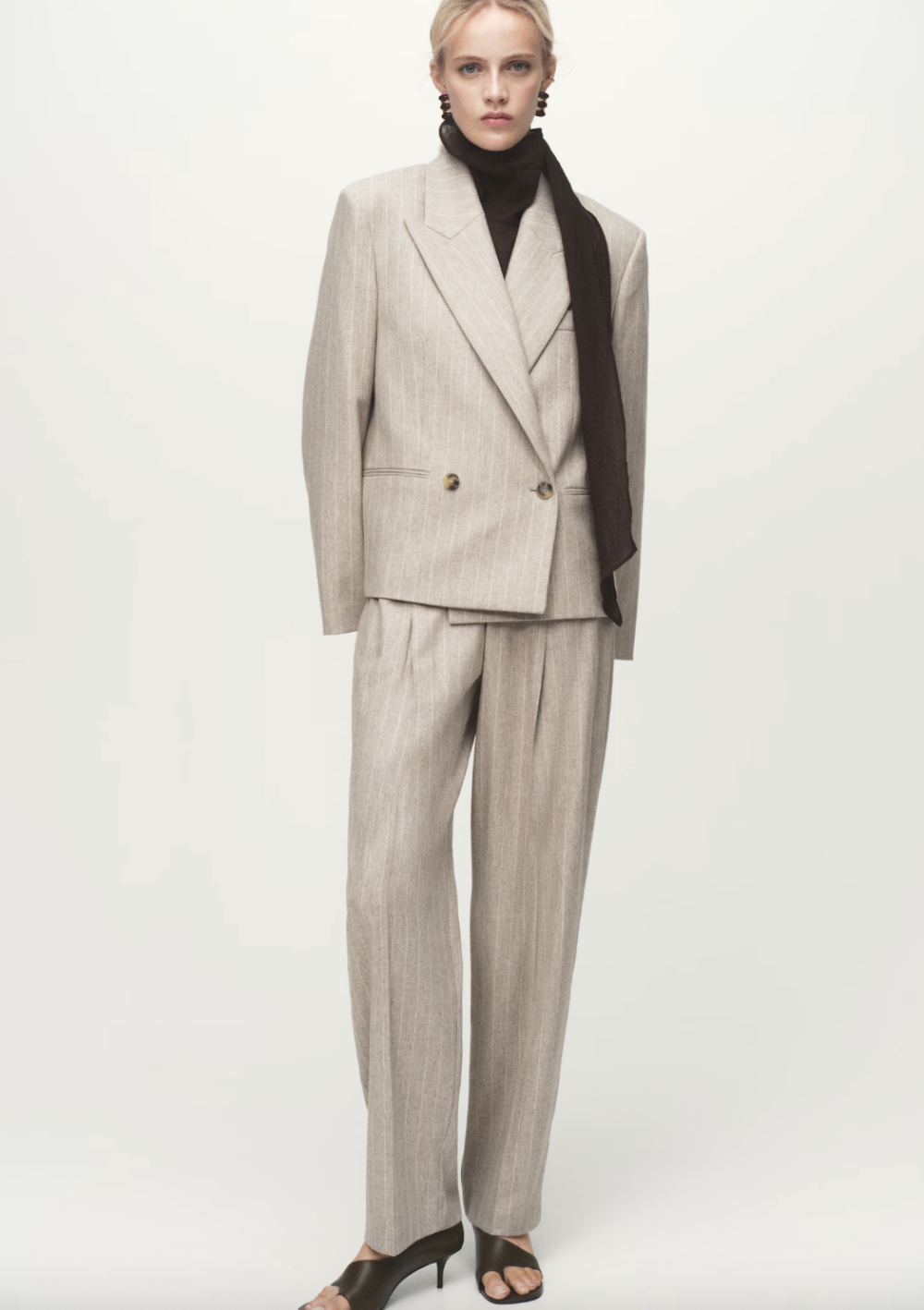 Dvodijelni set od fine vune s dvostrukim kopčanjem (sako 149 eura, hlače 89,95 eura) ističe se jednostavnošću i profinjenošću. Bez klasičnih revera, ali s diskretnim prugama, ovaj sivi kostim odiše suptilnim luksuzom. Dovoljni su vam tek decentan nakit i cipele s potpeticom – ili bijela majica ispod za ležerniji ton.