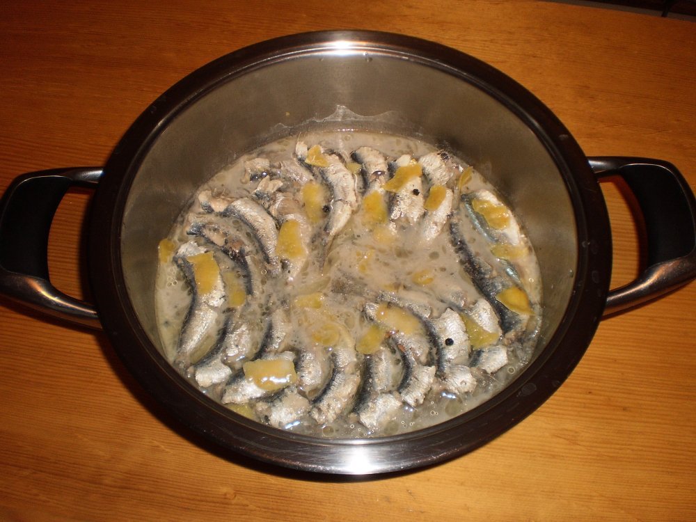 Dodati vode da pokrije srdele. Staviti par zrna papra.