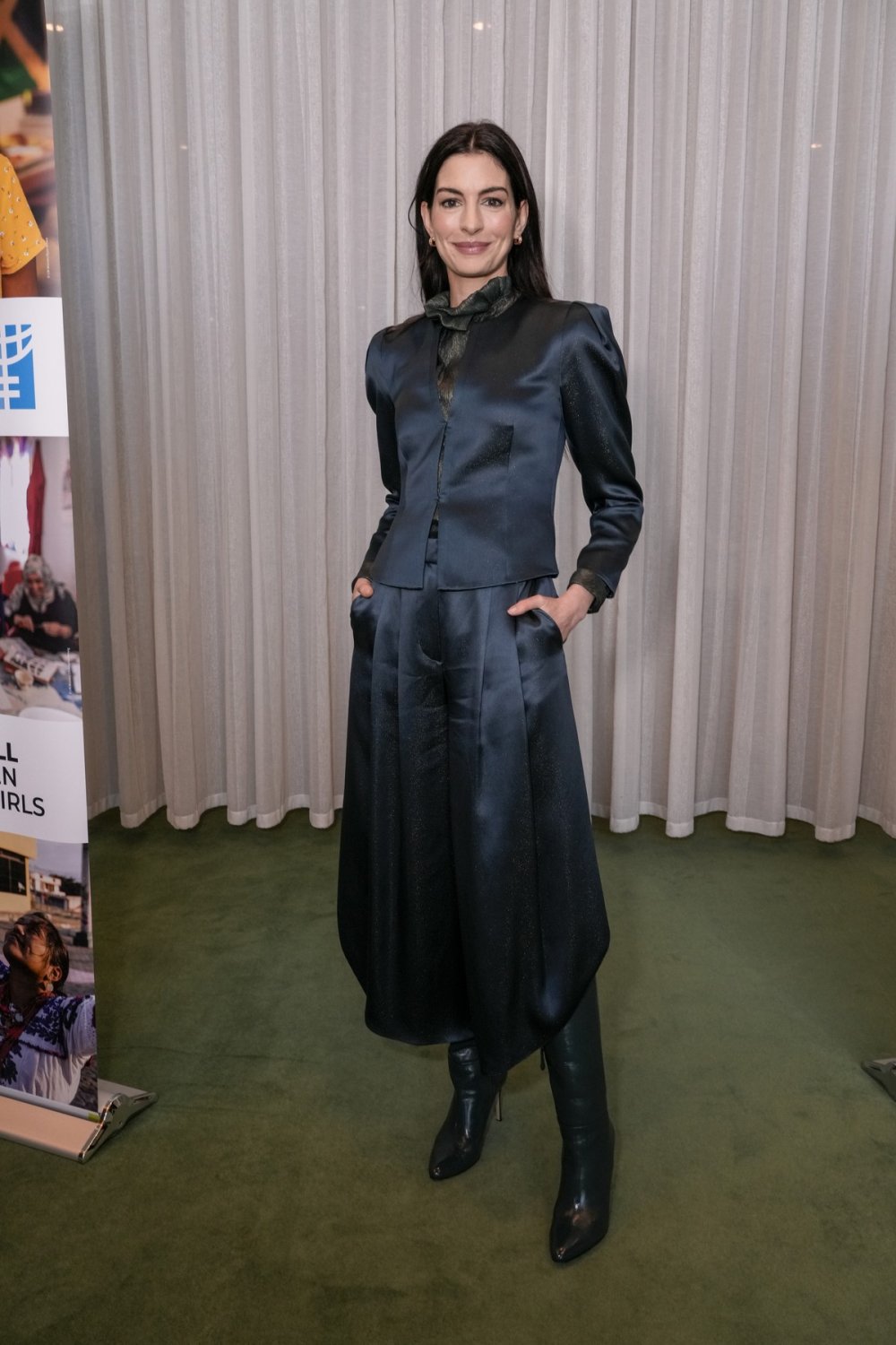 Za tu prigodu Hathaway je odabrala tamno plavi sako i hlače od finog satena – elegantan, odmjeren izbor koji se sasvim prirodno uklopio uz njezinu ulogu glasnogovornice, a ne filmske zvijezde.