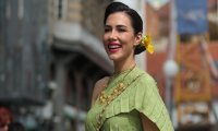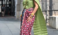 Dizajnerica i bivša manekenka ove je prekrasne cipele kombinirala s dvodijelnim kompletom sastavljenim od skraćenog topa rukava srednje duljine i srcolikog izreza te midi suknjom. Oba komada su nježne krem boje i obogaćena efektnim zlatnim vezom.