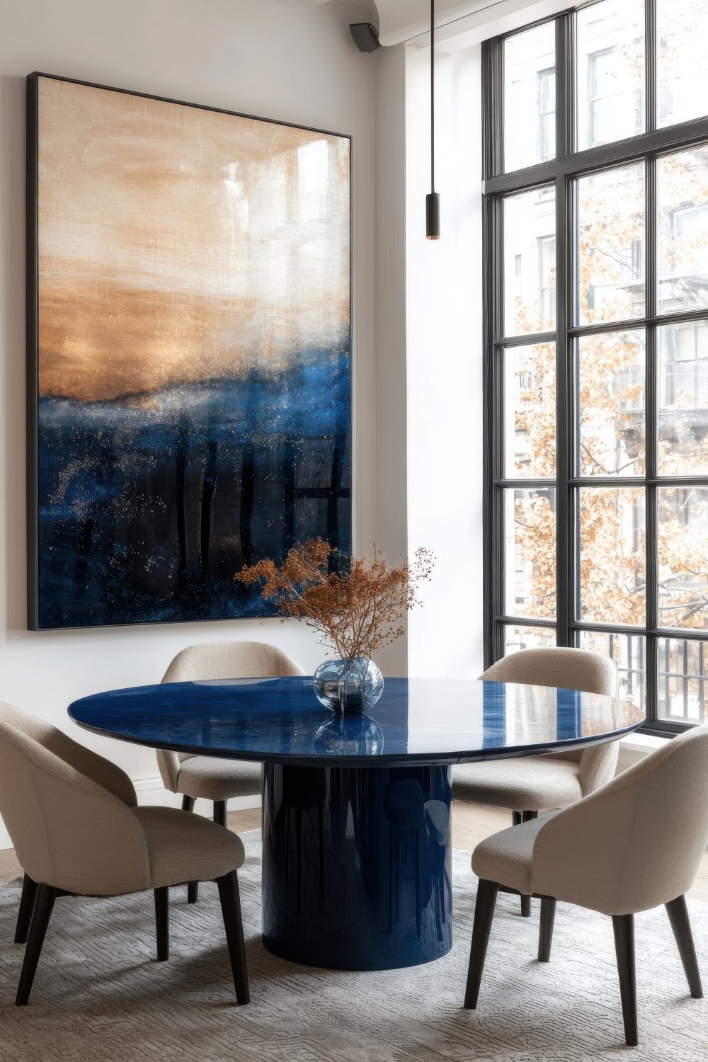 Ako vam se potpuno plava blagovaonica čini previše odvažnom, postoji i suptilniji pristup – neutralan stol i stolice u naglašenoj boji. Na taj se način postiže efektan izgled bez velikog rizika. Završni dodir daju detalji poput vaza, svijećnjaka ili posuđa u boji koja se pojavljuje na umjetnini, čime se cijeli prostor vizualno povezuje u skladnu cjelinu.