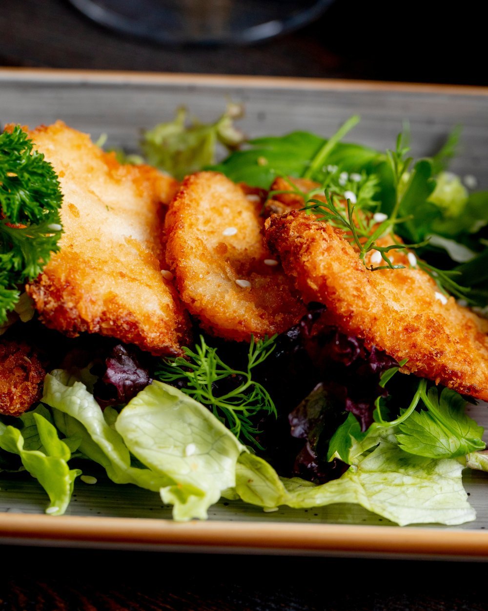 Pileća prsa narežite na male, tanke filete. Ogulite i nasjeckajte režnjeve češnjaka. Pinjole nasjeckajte, stavite u zdjelu s krušnim mrvicama, češnjakom i peršinom te promiješajte.
