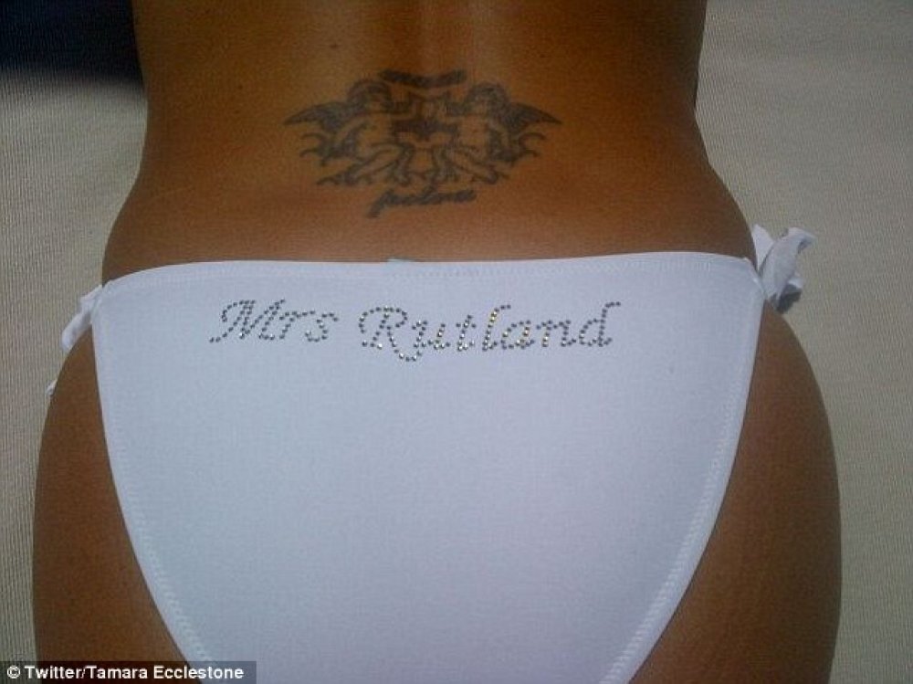 Sliku svoje guze u bijelom bikiniju na kojemu je dijamantima ispisano 'Gospođa Rutland' objavila je na Twitteru a pokraj nje je napisala 'Sretna…'