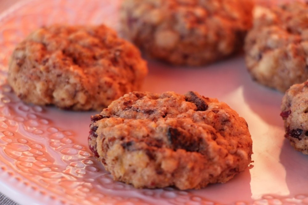 Maslac pjenasto umutite pa u njega umiješajte jaja. Brašno pomiješajte sa šećerom, solju i začinima pa ga, zajedno s voćem, lješnjacima, pahuljicama i čokoladom umiješajte u smjesu maslaca i jaja. Dobro promiješajte i stavite u hladnjak. Pećnicu zagrijte na 160 °C. Od ohlađene smjese, žličicama ili rukama, oblikujte keksiće i slažite ih na lim prekriven papirom za pečenje. Kekse pecite 10-ak minuta, tj. dok lagano ne porumene. Ohladite u limu pa ih servirajte.