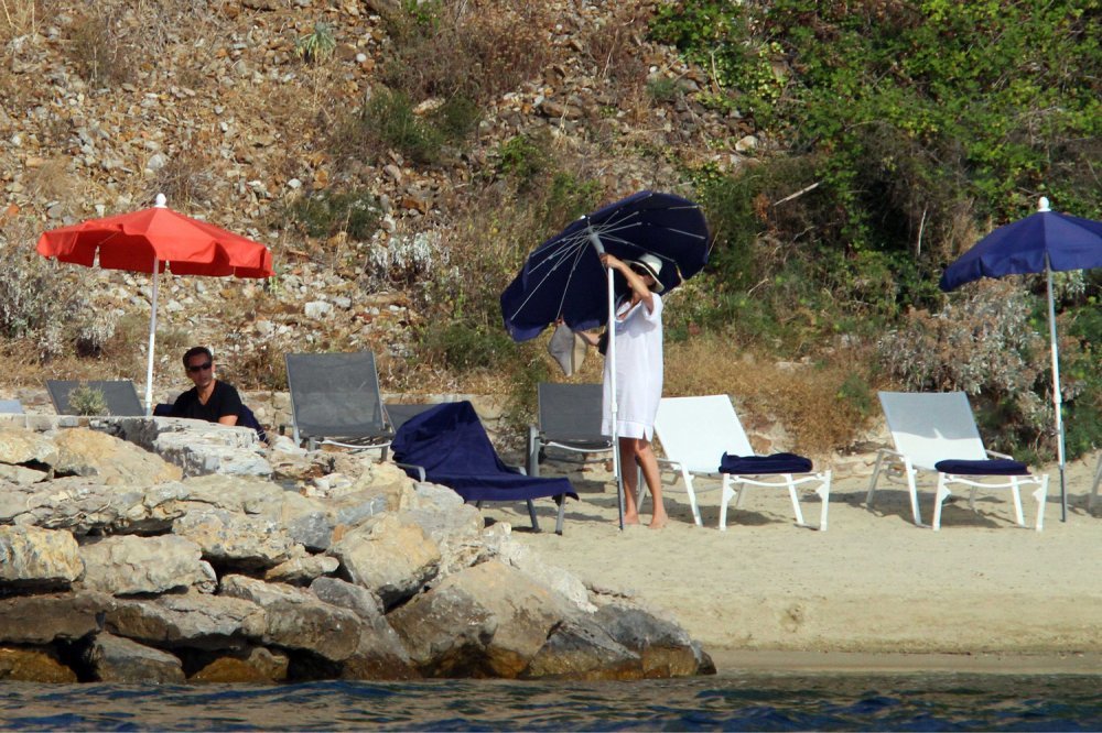 Carla Bruni uživa pozornost supruga Nicolasa Sarkozyja u trenucima morskog odmora u predsjedničkoj rezidenciji Fort de Bregancon. Pokazala je trbuščić i lijepu trudničku figuru koja je krasi u 43. godini života. No čim je sunce jače upržilo, obukla je bijelu tuniku i sakrila se dublje ispod tamnog suncobrana.