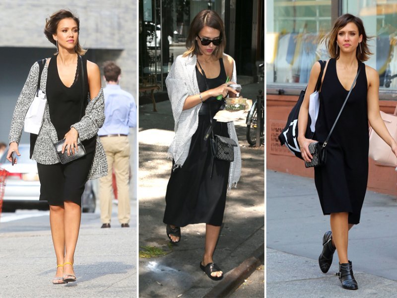 Uz crnu haljinu vrećastog kroja s polukružnim izrezima na leđima, koju je nosila idući dan, Jessica je obula druge cipele i dodala vestu. Nakon šopinga u ravnim čizmicama lijepa je glumica obula štikle jer je vjerojatno imala sastanak. Naime, njezina tvrtka s prirodnim proizvodima samo raste pa je glumica nedavno predstavila i liniju za bebe u Singapuru.