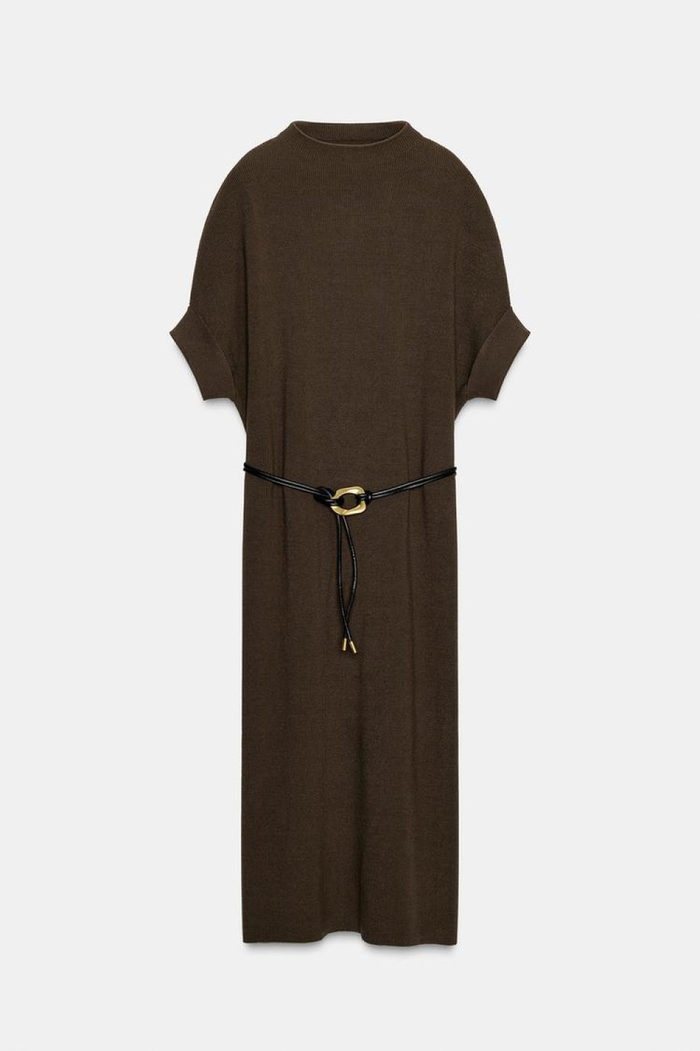 Riječ je o širokoj pletenoj haljini s podignutim ovratnikom i kratkim rukavima, upotpunjenoj remenom od umjetne kože sa zlatnom kopčom. Ova haljina u toploj smeđoj nijansi, trenutno najpopularnijoj boji sezone, osvaja svojom jednostavnošću i sofisticiranošću, a cijena od 35.95 eura čini je još privlačnijom.