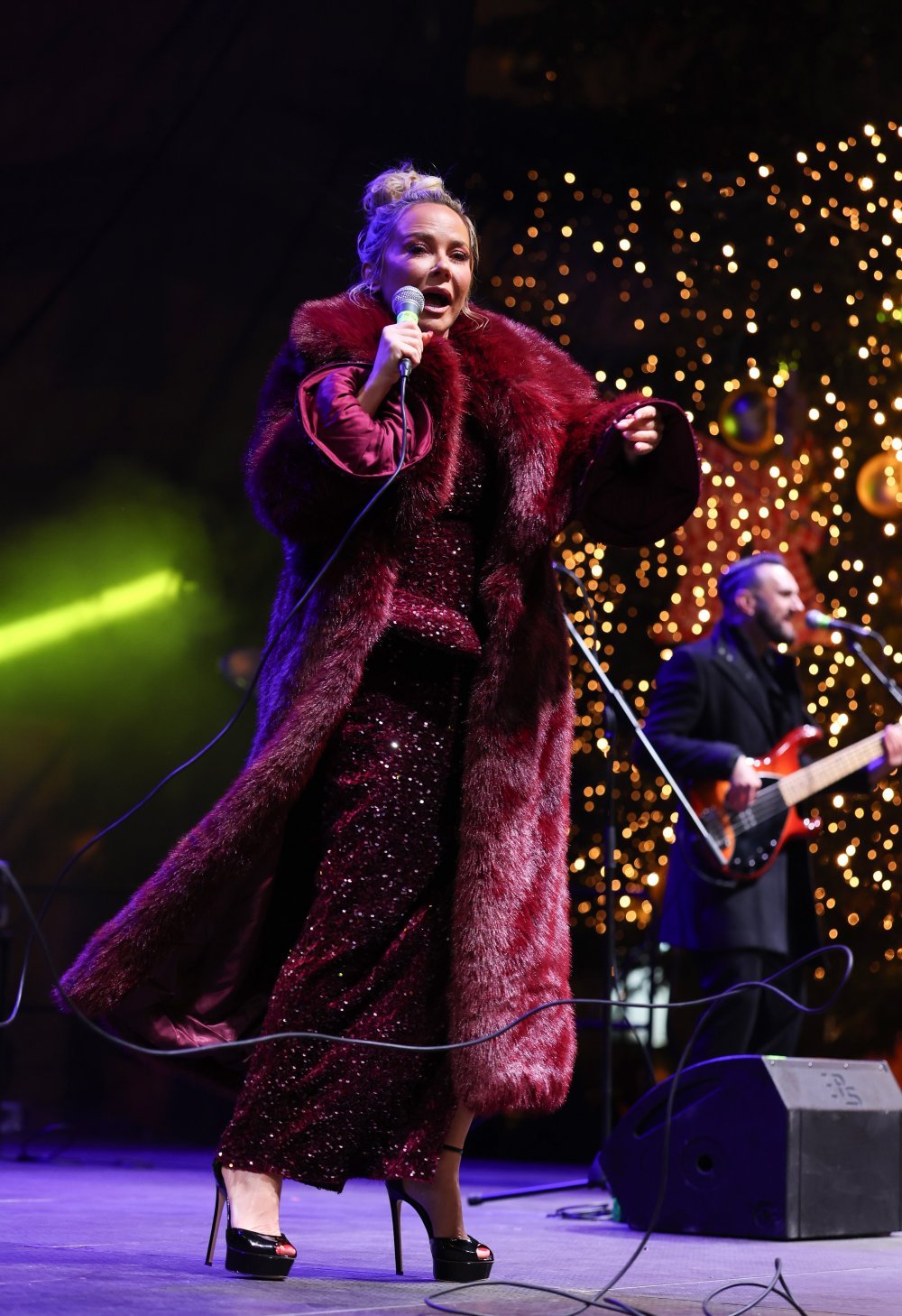Pripijenu haljinu dugih rukava naglašenih ramena ačinjenu od šljokičaste tkanine koja ističe figuru spojila je s bundom maxi duljine i platforma sandalama u istom tonu tamnocrvene nijanse koja već neko vrijeme dominira modnom scenom.