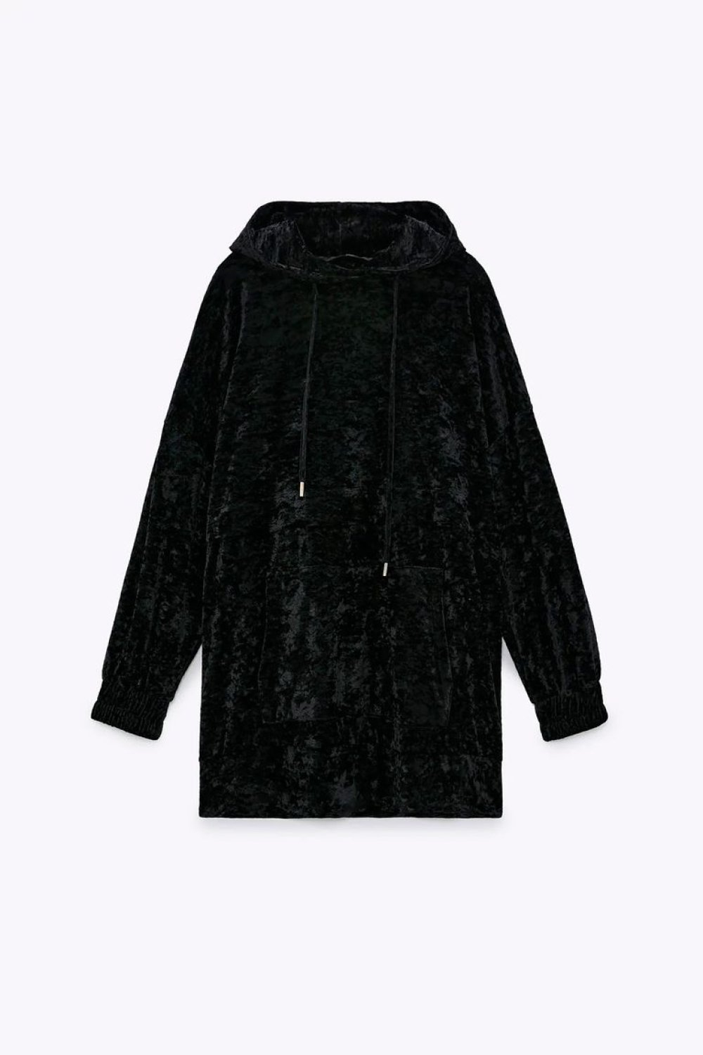 Stvorena od crne baršunaste tkanine, trenirku sa Zarinim potpisom čini predimenzionirana majica hoodie sa velikim džepom (230 kuna) i klasične hlače jogger (150 kuna) a njezin svečani dojam, osim baršuna, osiguravaju i zlatni detalji na vezicama.