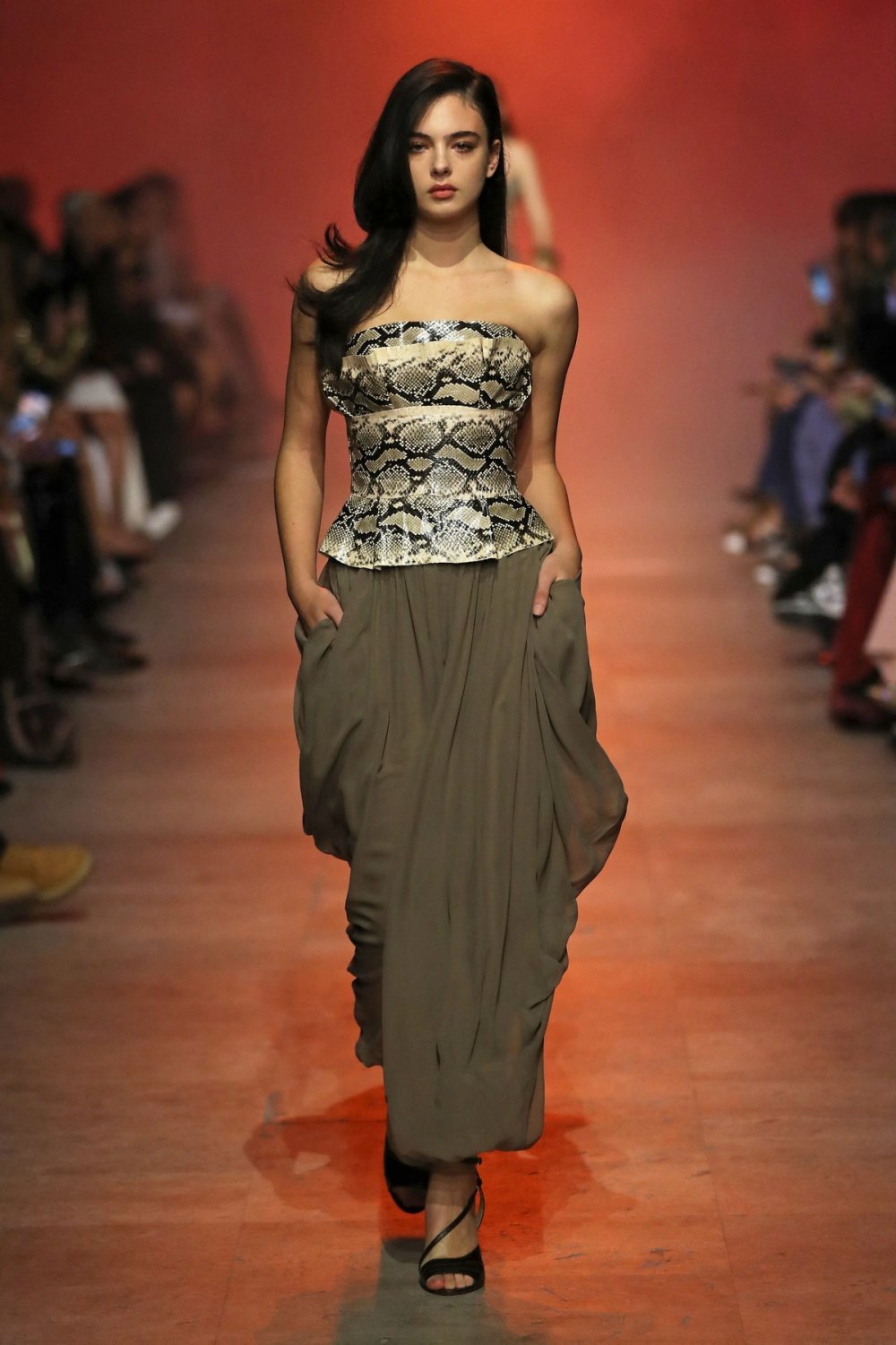U drugom izdanju, Deva je pokazala ležerniju, ali i dalje veoma elegantnu verziju svog stila – obukla je korzet s uzrokom pitona i predimenzionirane, drapirane kaki hlače uz ravne kožne sandale.