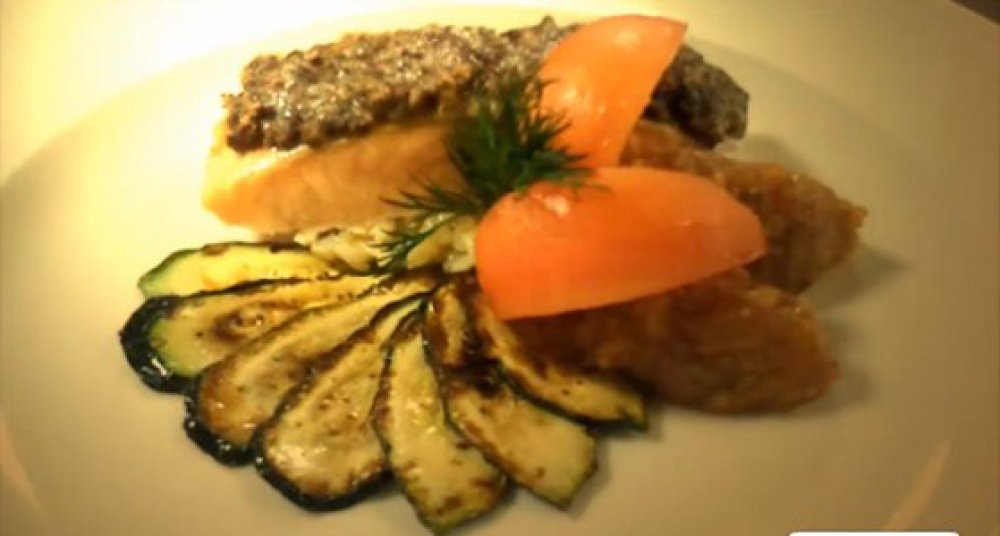 Potrebni sastojci za file lososa s koricom tamne čokolade za jednu osobu su: 140 grama svježeg lososa, peršin, luk, šampinjoni, povrće za temeljac, dvije šnite toast kruha, 20 grama tvrdog sira, 40 grama riže, 35 grama tamne čokolade, 2 grama suhog čilija, 30 grama tikvica, rajčica, sol, papar, maslinovo ulje, 1dl bijeloga vina, riblje kosti za temeljac i samo pratite upute u videu.