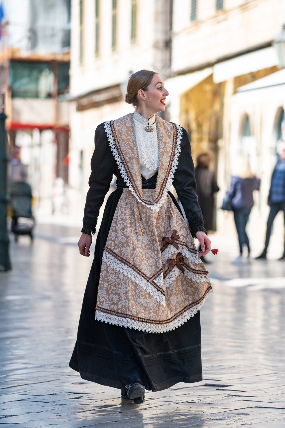 Stradunom je prošetala djevojka u tradicionalnoj nošnji i potpuno zasjenila sve moderne trendove. S ponosom je nosila bogato ukrašenu nošnju, ističući svevremensku ljepotu lokalnog kraja. Njezin najjači adut bio je topao osmijeh i graciozan hod kojim je pokazala kako se tradicija nosi s neviđenom dozom samopouzdanja.