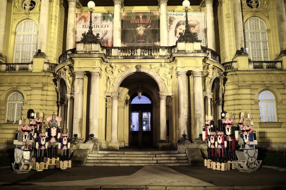 Zgrada Hrvatskog narodnog kazališta osvijetljena je kao velika adventska scenografija. Prostor oko HNK-a pretvara se u jedan od najfotogeničnijih urbanih punktova: mješavinu arhitekture, blagdanskog sjaja i umjetničke atmosfere koja poziva na popodnevnu šetnju i kratko stajanje ispred objektiva.