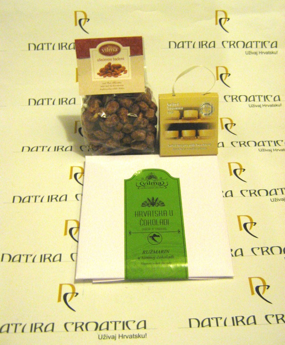 Vilma Natura Croatica daruje vam poseban poklon paket koji sadrži čokoladu iz edicije Hrvatska u čokoladi (tamna čokolada s ružmarinom 100g), neodoljive bademe u šećeru i suvenir pakiranje keksa s vrhunskim paškim sirom. Sve proizvode proizvodi Pekarna slastica Vilma s predivnog otoka Raba.