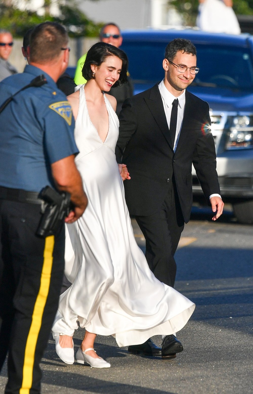 Za poseban dan Qualley je odabrala dvije vjenčanice. U verziji od bijelog satena, po uzoru na bezvremenske haljine slip kroja, prošetala se pred okupljenim fotoreporterima u pratnji novopečenog supruga.