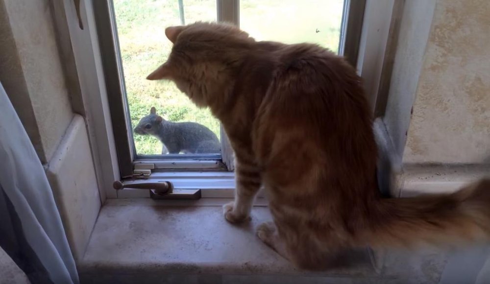 Nemoćni mačak uzalud je pokušao pronaći način kako uloviti vjevericu koja ga je neustrašivo promatrala kako šapama udara po prozoru prije odlaska u nepoznatom smjeru.