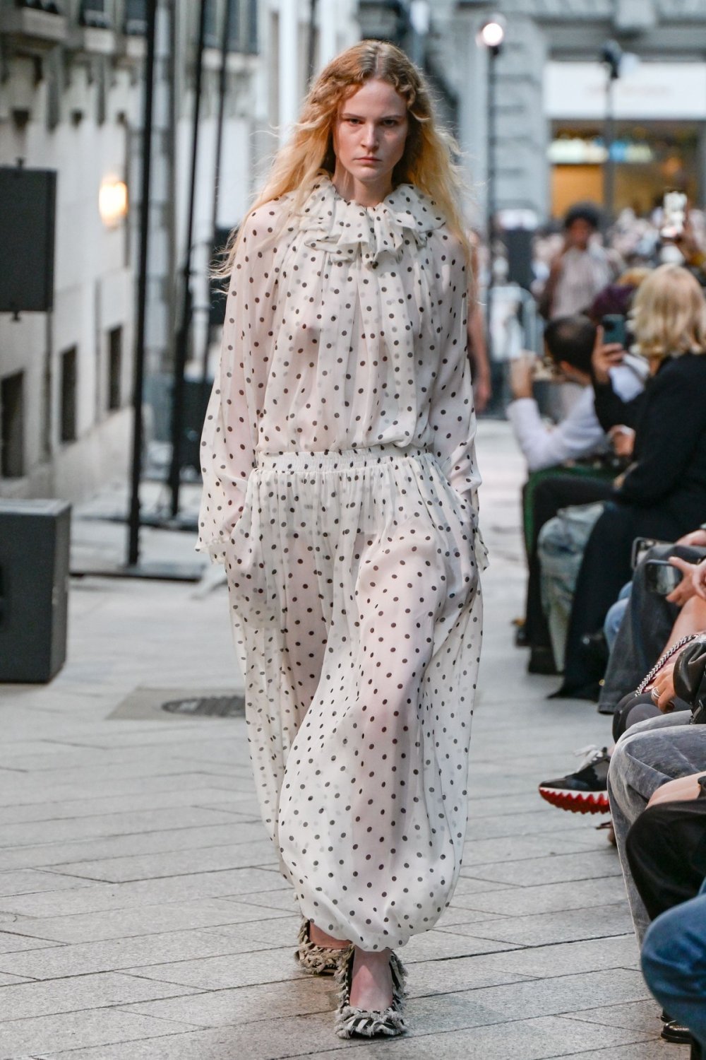 S druge strane, dizajneri su ponudili i odvažnije verzije. U kolekcijama brendova Valentino i Dries Van Noten točkice dolaze na poluprozirnim tkaninama, dok Nina Ricci eksperimentira s kombiniranjem različitih veličina uzorka na jednoj odjevnoj kombinaciji.