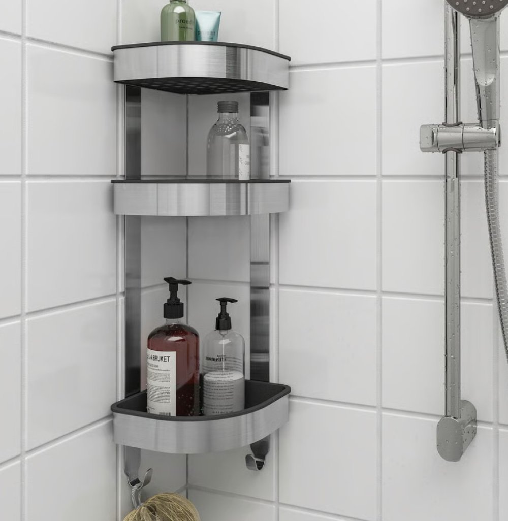 Ova kutna polica od nehrđajućeg čelika nudi dovoljno prostora za sve kupaonske proizvode. Donja polica ima i kuke za spužve za kupanje. Premda se montira pomoću vijaka, neki su korisnici koristili 3M dvostranu ljepljivu traku da bi izbjegli bušenje.