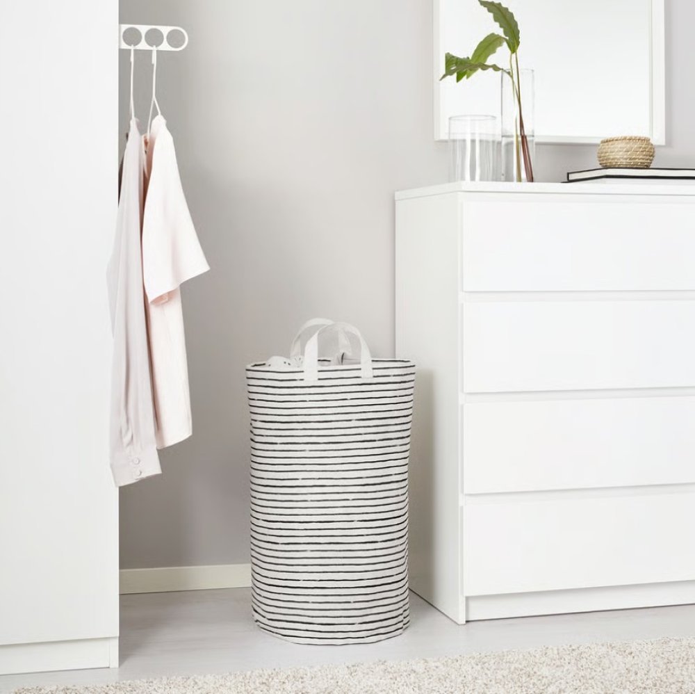 Vreća s crno-bijelim prugama i ojačanim ručkama olakšava prenošenje rublja, a plastični premaz iznutra sprječava nakupljanje vlage. Može se sklopiti kad nije u upotrebi.