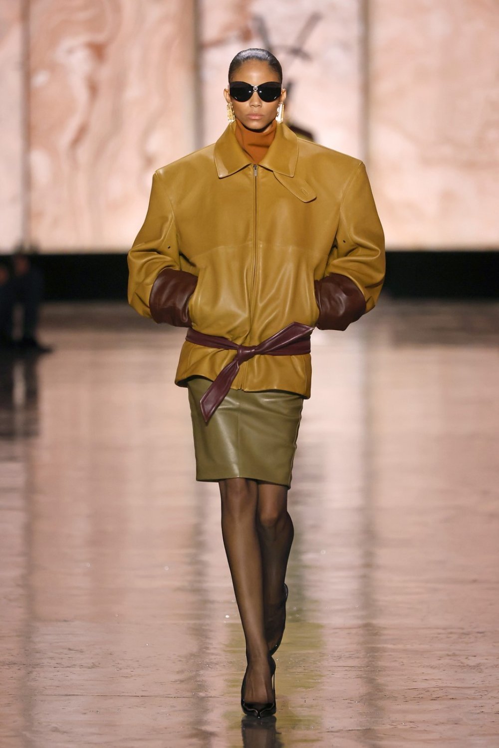 U kolekcijama Acne Studiosa i Saint Laurenta dominiraju crvene nijanse: Acne ju kombinira s mornarski plavim topom i bijelim čizmama, dok Anthony Vaccarello za Saint Laurent spaja kožnu suknju s jaknom širokih ramena i tankim remenom u struku.