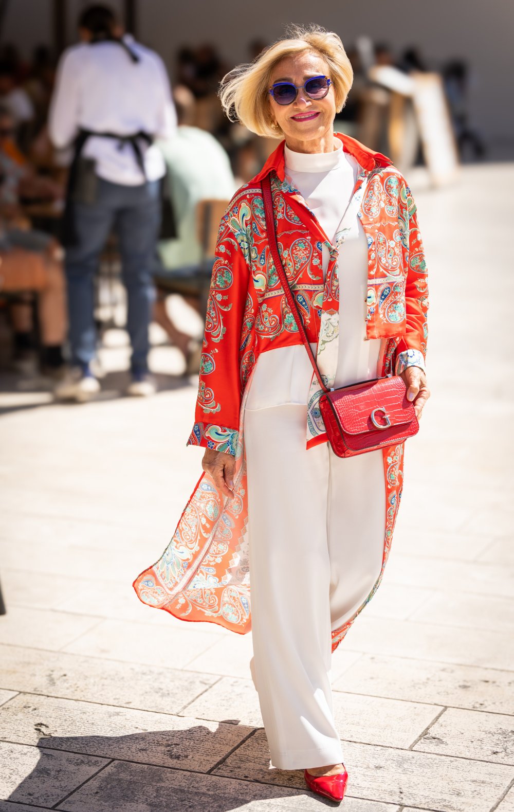 Bazu njezina splitskog izdanja činile su lagane bijele hlače i klasični bijeli T-shirt - kombinacija koju je nadogradila efektnom crvenom bluzom asimetričnog kroja, ukrašenom paisley uzorkom i s detaljem ukrasne trake oko vrata.