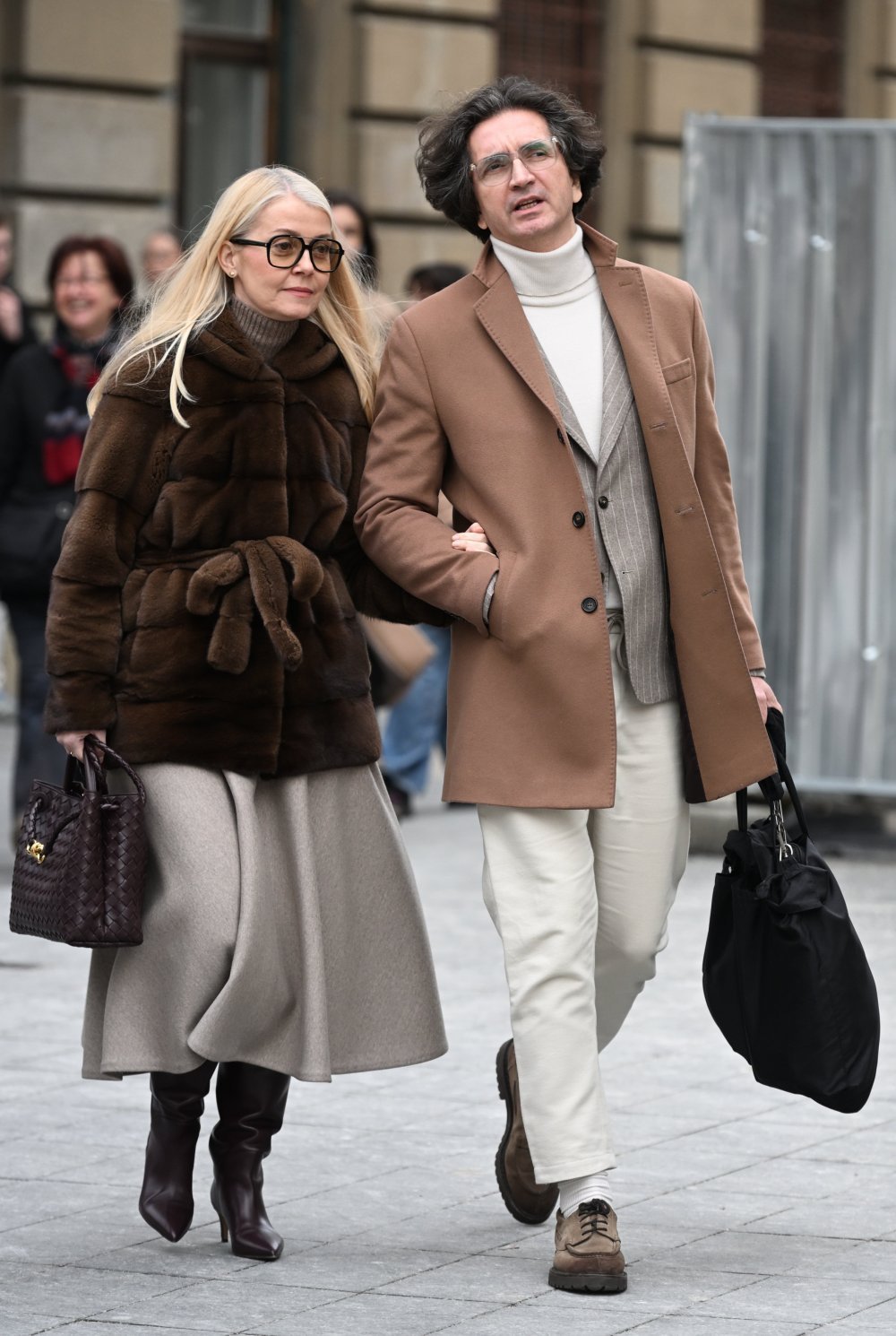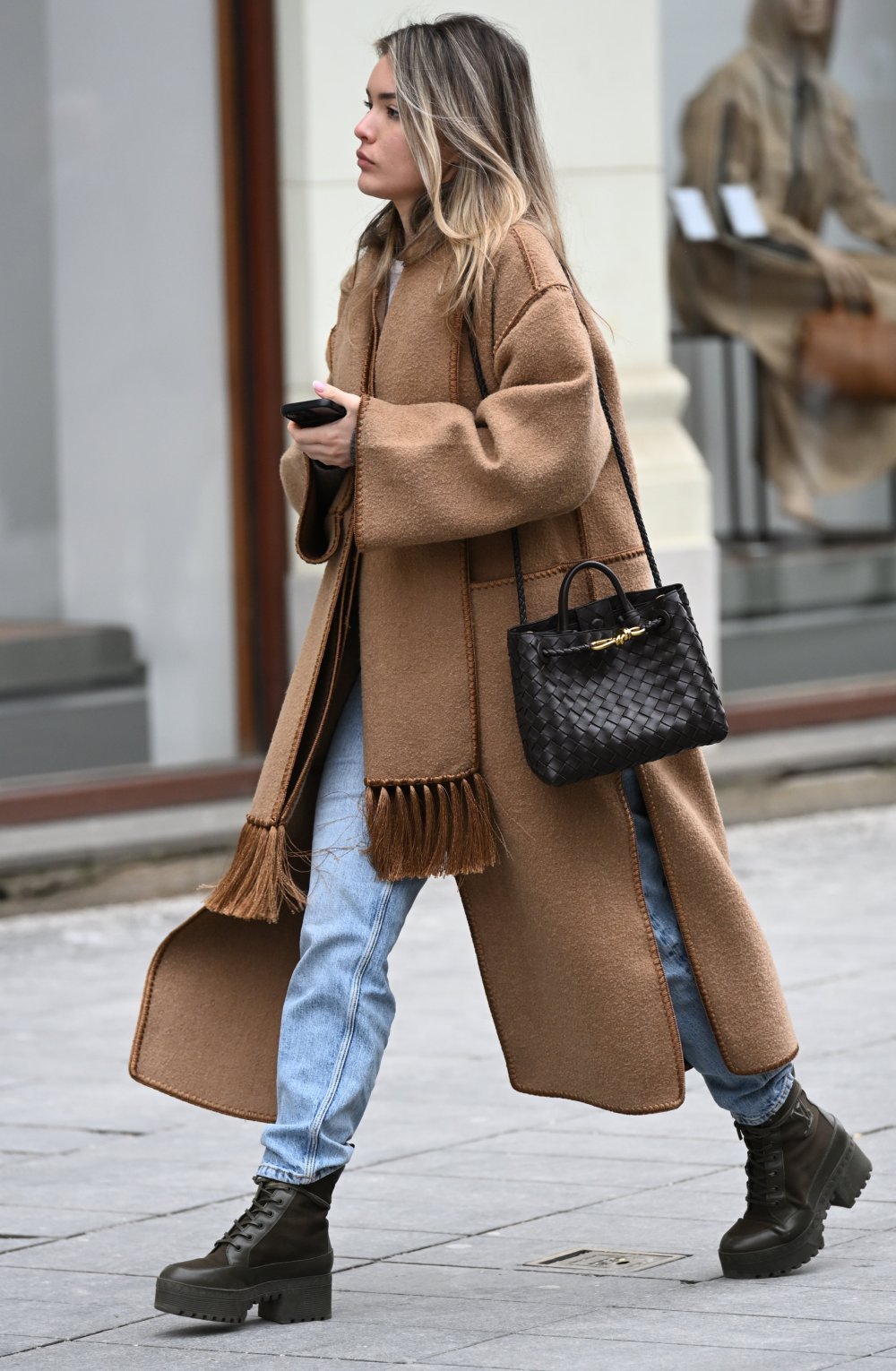 Posebnu pažnju plijenila je plavuša koja je nosila crnu Bottega Veneta Andiamo torbicu - model koji je u kratkom roku postao simbol suvremenog luksuza. Kombinirala ju je s ravnim trapericama, bajkerskim čizmama i smeđim kaputom s ušivnim šalom, stvarajući balans između urbane nonšalancije i sofisticiranog minimalizma. Upravo je Andiamo model dao završni pečat cijelom outfitu - dovoljno upečatljiv, a opet nenametljiv.