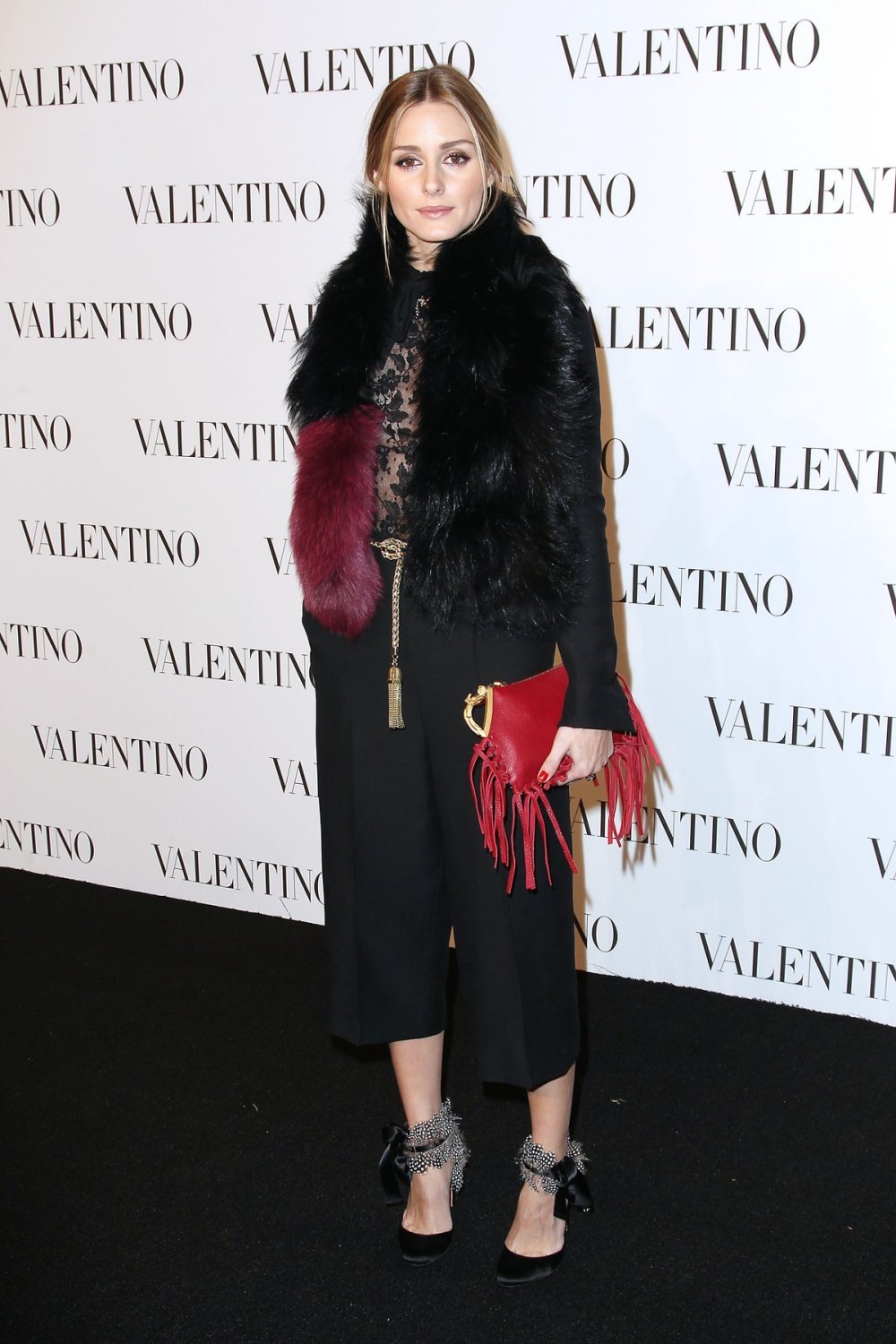 Olivia je za ovu posebnu prigodu nosila gotovo sve s potpisom Valentino, osim cipela. Trendi culottes, hlače koje sežu do polovine listova zaista treba znati nositi, a ona ih je uparila s čipkastom majicom, remenčićem i tome dodala malo krzna poput prave dive. Tu je i Valentinova torba s resicama, a znamo da su one veliki hit ove sezone.