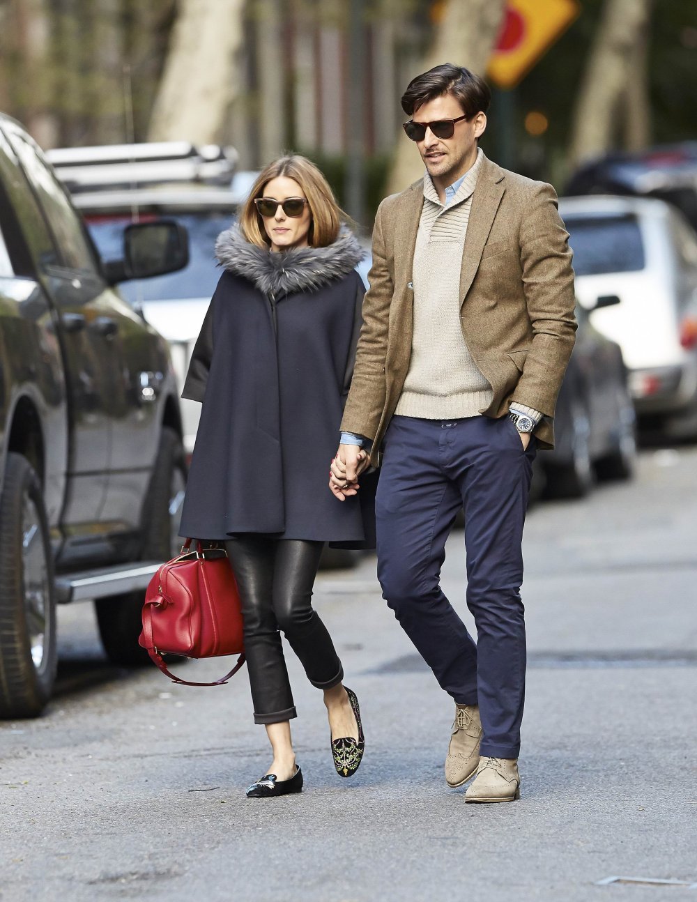 Predivna Olivia izgleda sjajno u pelerini s krznenim ovratnikom, a na nogama ima trendi kožnate hlače, koje samo ona može podvrnuti i izgledati dobro. Njezin zaručnik bio je u jakni boje pijeska i malo svjetlijim cipelama i vesti te tamnoplavim hlačama. Baš dandyjevski šik.