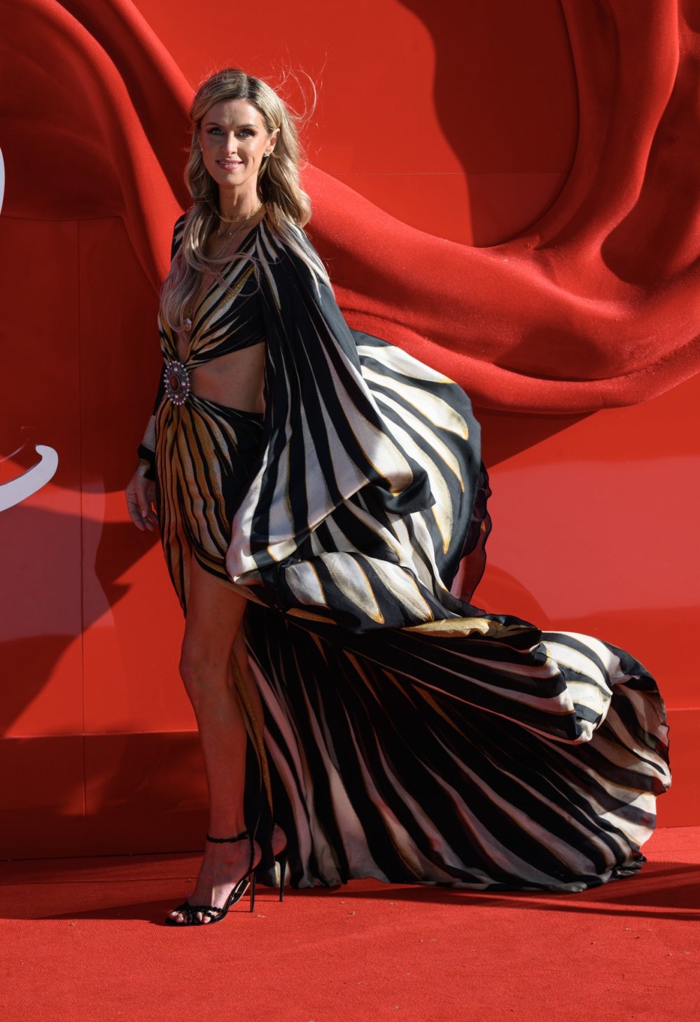 Njezin look obilježila je lepršava haljina s grafičkim uzorkom u crnoj, zlatnoj i neutralnim tonovima. Kroj s naglašenim izrezima i visokim prorezom otkrivao je siluetu, a središnji dekorativni detalj u području struka naglašavao je liniju tijela.