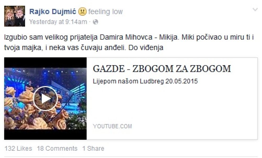 'Izgubio sam velikog prijatelja Damira Mihovca Mikija. Miki, počivao u miru, i ti i tvoja majka, i neka vas čuvaju anđeli. Do viđenja', napisao je Dujmić, a Marina Tomašević od dragog kolege oprostila se riječima: 'Dragi naš Miki... veliki čovjek... veliki prijatelj... Iskrena sućut svima koji su ga znali i voljeli!'