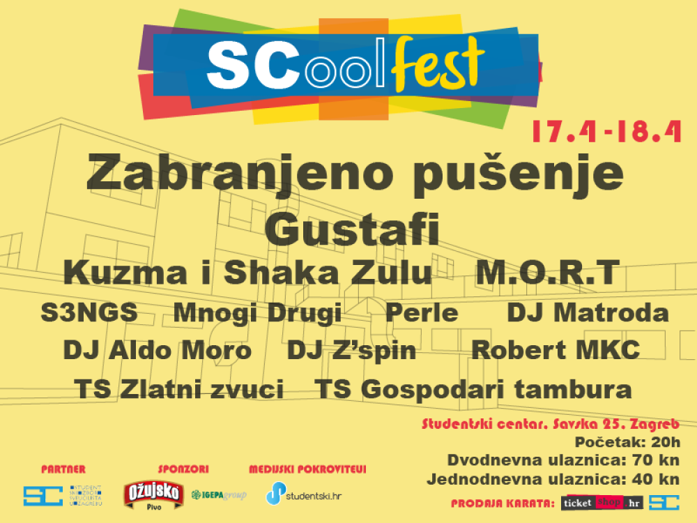 Studentski centar, 17. i 18. travnja, otvorit će svoja vrata mnogobrojnoj publici i ugostiti poznata imena brineći pritom da zadovoljeni budu najrazličitiji glazbeni ukusi. Glavni organizator SCool Festa, Studentski zbor Sveučilišta u Zagrebu, organizacijom festivala studente želi vratiti u SC i pružiti zagre bačkoj glazbenoj sceni nešto novo i osvježavajuće. Ako ste se nakon duge zime zaželjeli poštenog izlaska i plesa do ranih jutarnjih sati među mnoštvom ljudi, onda svakako nećete propustiti prvi po redu SCool Fest
