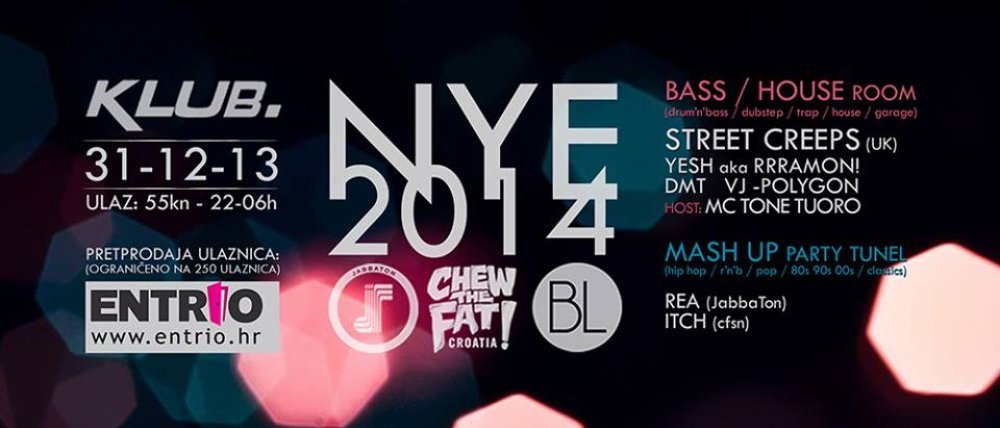 Jedini bass doček Nove godine u Zagrebu 31. prosinca režira ekipa iz najpoznatijeg bass kolektiva Chew The Fat! Croatia, senzualnog Black Lighta te najdugovječnijeg klupskog programa JabbaTon iza kojih stoje Yesh i DMT. Uz njih nastupaju i Rea te Itch, domaćin večeri je MC Tone Tuoro, a za vizuale brine VJ-polygon. Zagrebački Klub. se u nekoliko mjeseci postojanja nametnuo u mjesto u kojem se redovito predstavljaju novi bendovi i projekti te kao meka elektronskog zvuka u centru grada. Uz odličan razglas i redovito sjana gostovanja niti ova večer neće biti iznimka. Početak je u 22 sata, a tulum traje do 6 ujutro. Ulaznice kupite u pretprodaji po cijeni od 55 kuna.