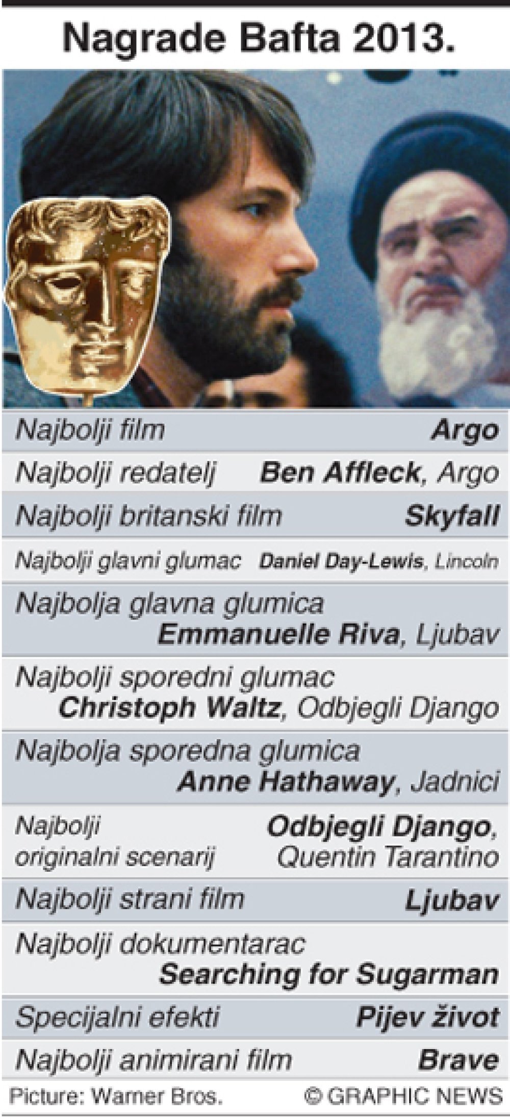 Nagradu za najbolji film na 67. dodjeli Britanske filmske akademije (BAFTA) dobila je na proglašenju u nedjelju epska povijesna drama Stevea McQueena '12 godina ropstva', najboljim glavnim glumcem proglašen je Chiwetel Ejiofor za ulogu u tom filmu, a za najbolju glavnu glumicu izabrana je Cate Blanchett za ulogu u filmu 'Jasmine French'.