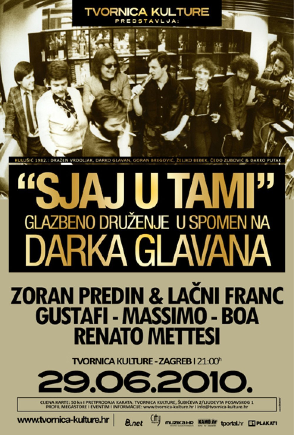 Koncertom pod nazivom 'Sjaj u tami' prijatelji, kolege, čitatelji njegovih tekstova o pop i rock glazbi, likovnoj umjetnosti i popularnoj kulturi te svi oni koji žele uživati u nastupima popularnih hrvatskih bendova prisjetit će se začetnika hrvatske rock kritike, uglednog likovnog kritičara, autora stotinjak izložbi i oca hrvatske popularne kulture Darka Glavana.