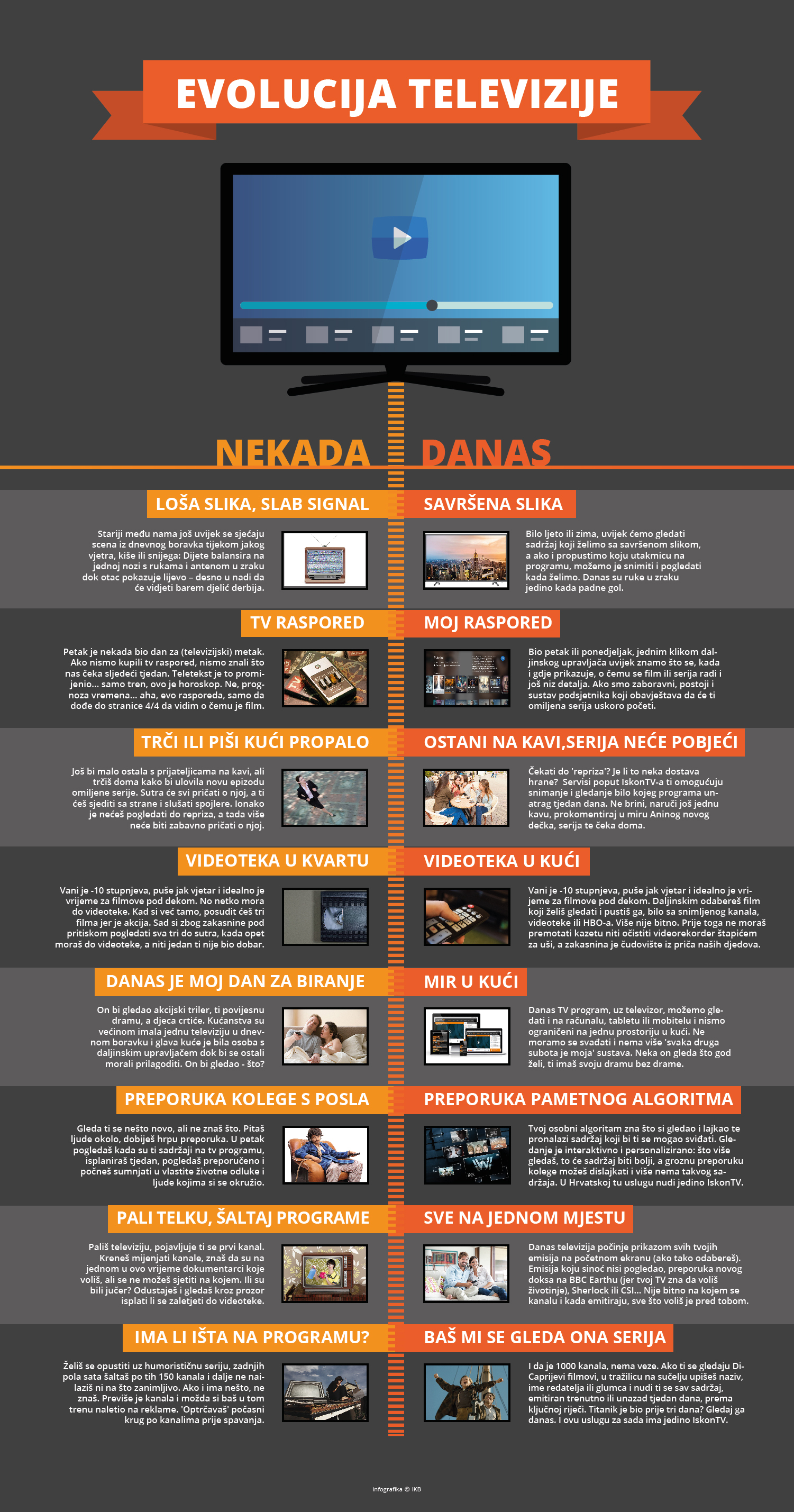 Nema više lova na signal, stalnog ustajanja kako bismo promijenili program, čišćenja glava videorekordera štapićima za uši i besciljnog prebacivanja ista tri kanala. Ti dani su iza nas. Televizija je danas interaktivno i personalizirano iskustvo s bezbroj opcija, a neke od načina na koje smo promijenili naše iskustvo na bolje pogledajte u infografici.