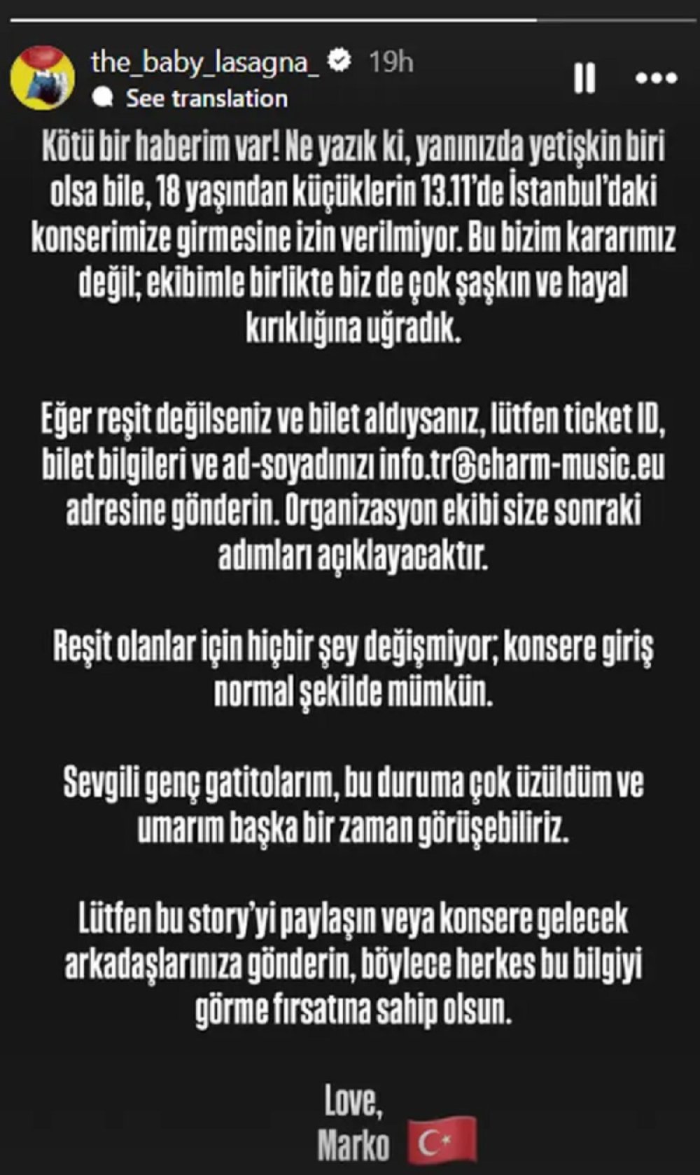 Tim povodom glazbenik se oglasio na društvenim mrežama. 'Imam loše vijesti! Nažalost djeci ispod 18 godina nije dozvoljen ulazak na naš koncert u Istanbulu 13.11. čak i ako su u pratnji odrasle osobe', poručio je.