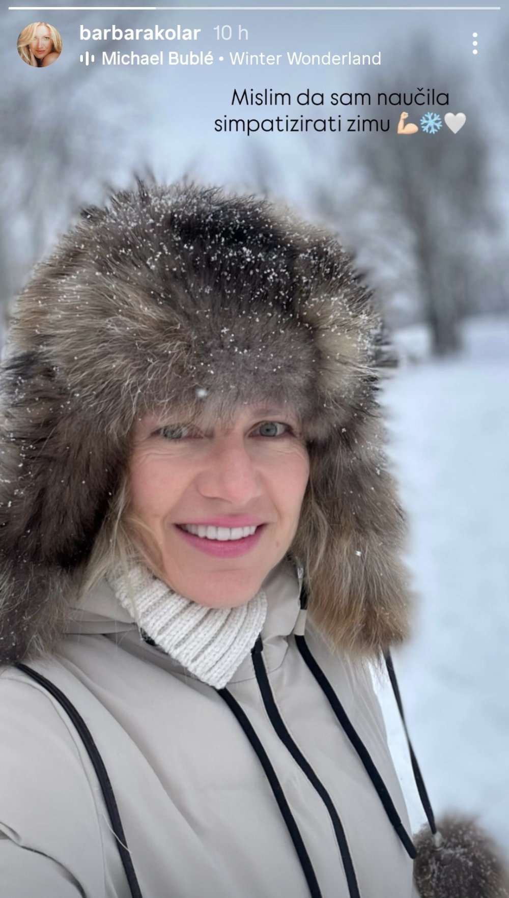 Barbara Kolar ponovno je razveselila pratitelje na Instagramu objavom iz snježnog krajolika. Pokazala je selfie u toploj jakni i velikoj krznenoj kapi, a pahulje na kosi i kapici dale su fotografiji pravi 'zimski razgledničarski' ugođaj.