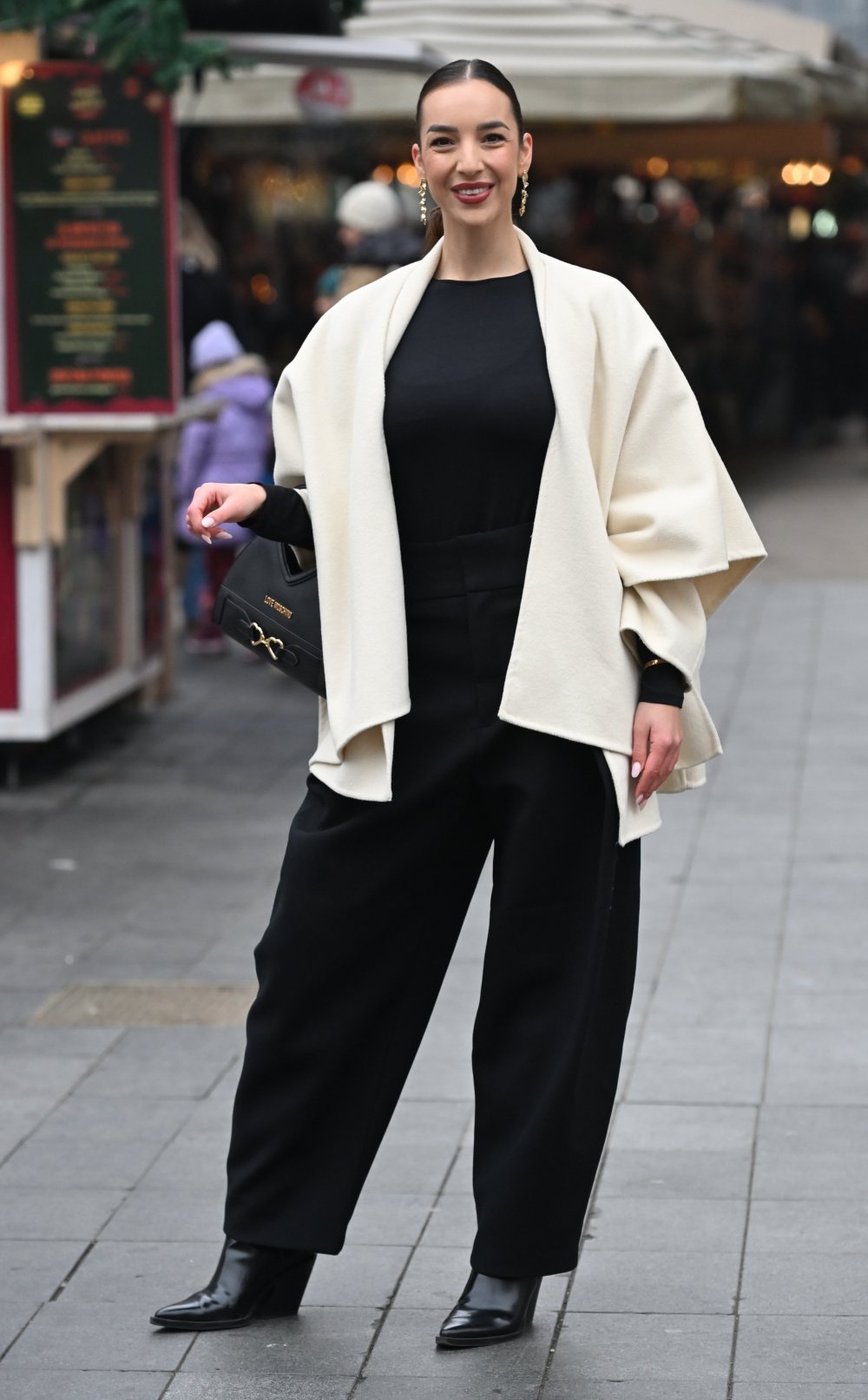 Ova samozatajna brineta, inače studentica medicine u Zagrebu, pokazala je da ima istančan modni ukus. Fotografi su je snimili u elegantnom izdanju koje nije moglo proći nezamijećeno. Crnu kombinaciju kojom su dominirale široke hlače 'razbila' je bijelom pelerinom.