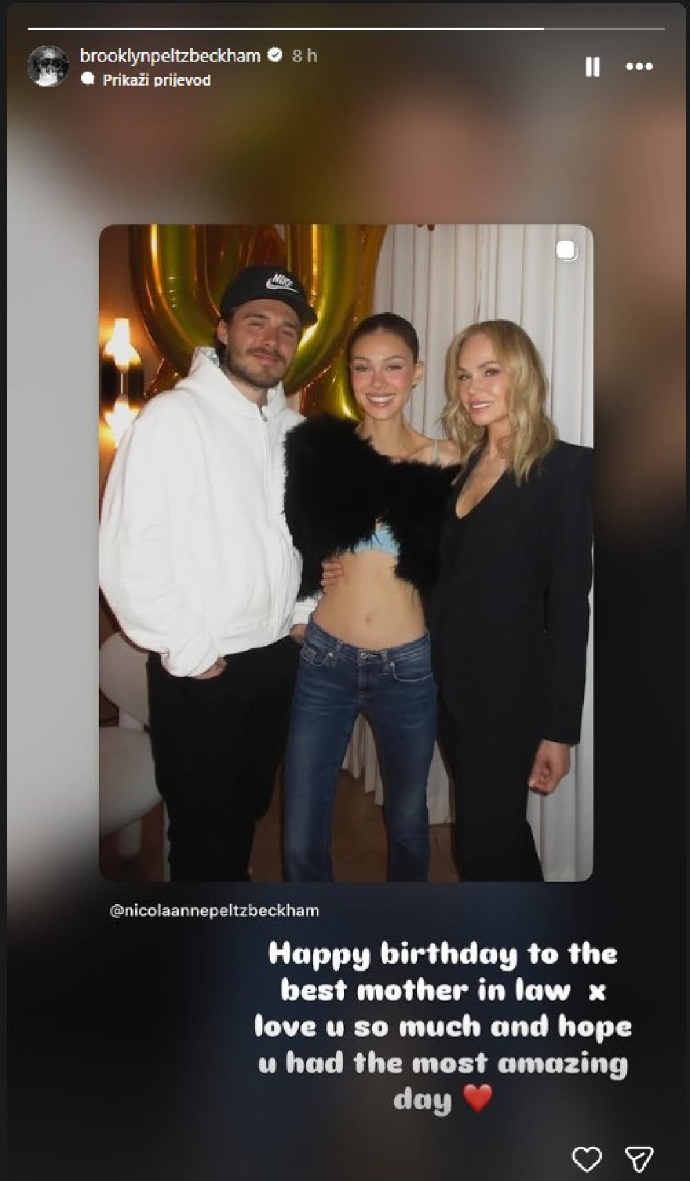 Brooklyn, koji danas živi u SAD-u sa suprugom Nicolom Peltz, u subotu je s njom slavio 71. rođendan njezine majke Claudije Heffner Peltz, bivše manekenke. Nedugo potom na Instagramu je podijelio fotografiju na kojoj pozira s Nicolom i punicom. Uz fotografiju je napisao: ‘Sretan rođendan najboljoj punici. Jako te volim i nadam se da si imala najljepši dan.’