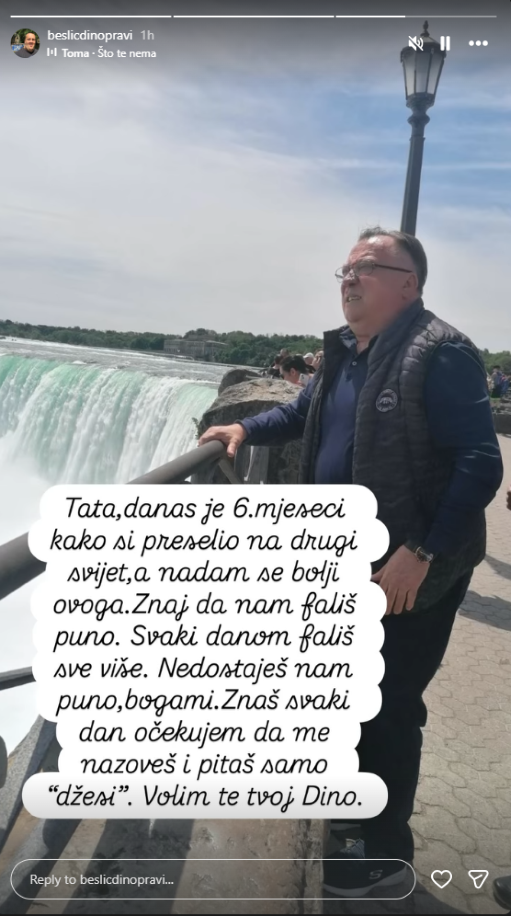'Tata, danas je šest mjeseci kako si se preselio na drugi svijet, a nadam se bolji od ovog. Znaj da nam fališ puno. Svaki dan fališ sve više. Nedostaješ nam puno, bogami. Znaš, svaki dan očekujem da me nazoveš i pitaš samo 'džesi'. Volim te, tvoj Dino', napisao je.