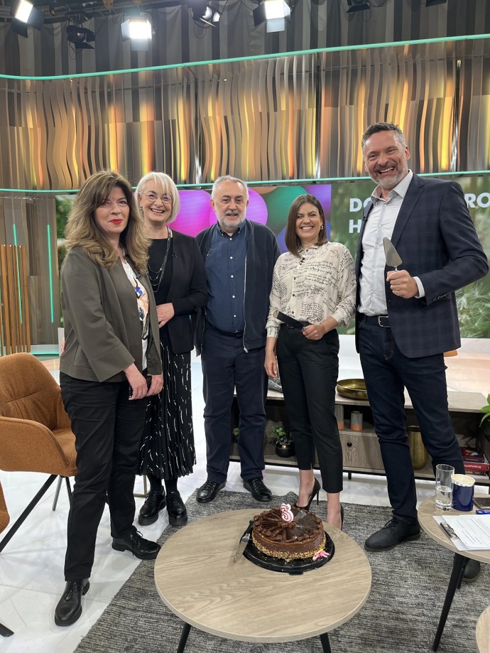 Pod vještom uredničkom palicom dnevne urednice emisije Ivane Štefelić voditelji Zlata Mück Sušec i Ognjen Golubić rođendansku su tortu rado podijelili s kolegama iz teleteksta u veselom slavljeničkom raspoloženju.