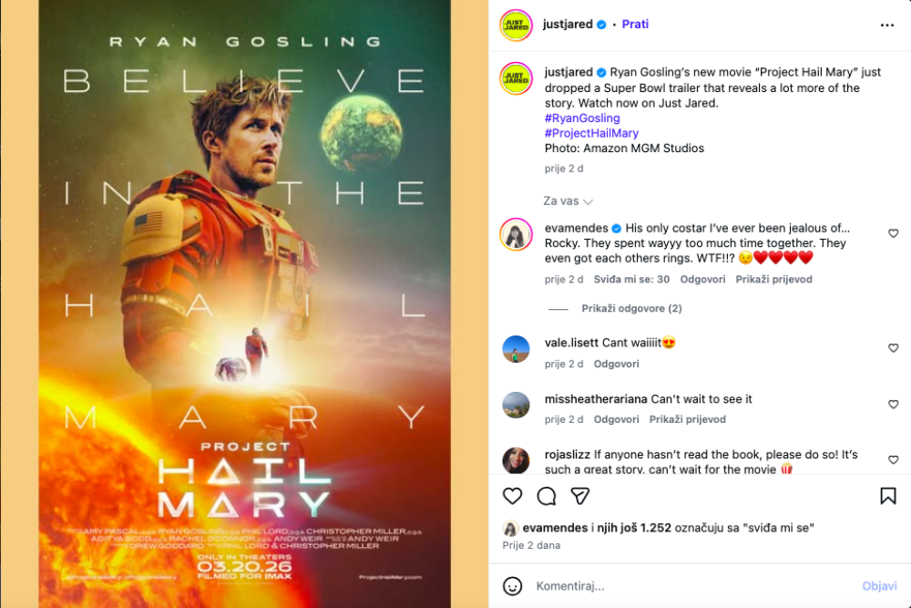 Ryan Gosling (45) ima bogatu i dugu karijeru, a na velikom platnu pojavljivao se uz vodeće dame Hollywooda poput Margot Robbie, Emme Stone i Emily Blunt. No njegova supruga Eva Mendes (51) priznala je da je u njegovom najnovijem filmu 'Project Hail Mary' u njoj ljubomoru izazvao - animirani vanzemaljac