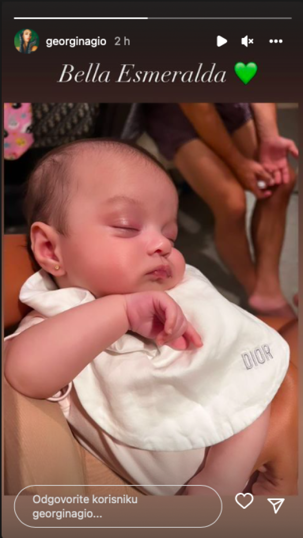 Na Instagram Storyju, na profilu na kojem je prati čak 39 milijuna ljudi iz cijeloga svijeta, Georgina Rodriguez objavila je fotografiju neodoljive tromjesečne Belle Esmeralde, svoje najmlađe kćeri koju je dobila s nogometašem Cristianom Ronaldom.
