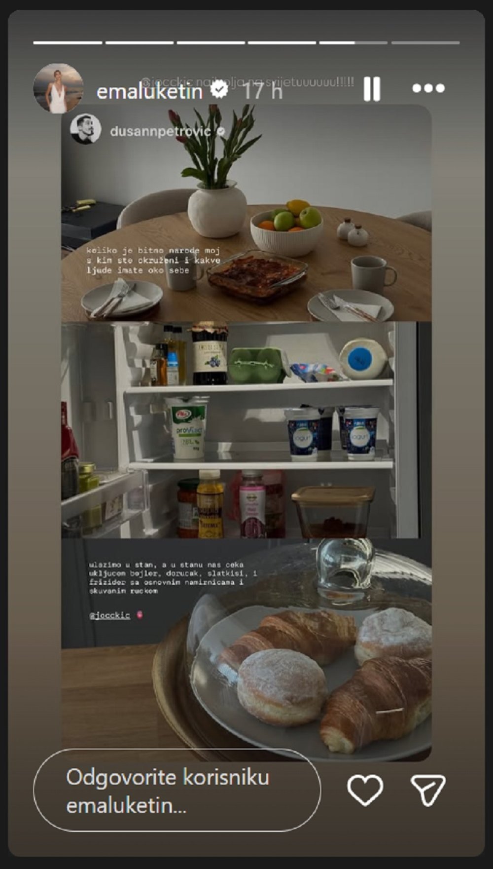 'Plan je bio da Dušan leti 2. 3. u Beograd na tjedan dana zbog posla, a da u tom periodu dolete moje cure na girls trip. Jako smo se svi veselili i plan je zvučao savršeno, dok se sve nije promijenilo u 24 sata. Nismo mogli riskirati da Dušan ode i potencijalno se ne može vratiti meni u Dubai, tako da sam i ja kupila kartu za njegov let kako se ne bismo odvajali', opisala je Ema Luketin situaciju na Instagram pričama.
