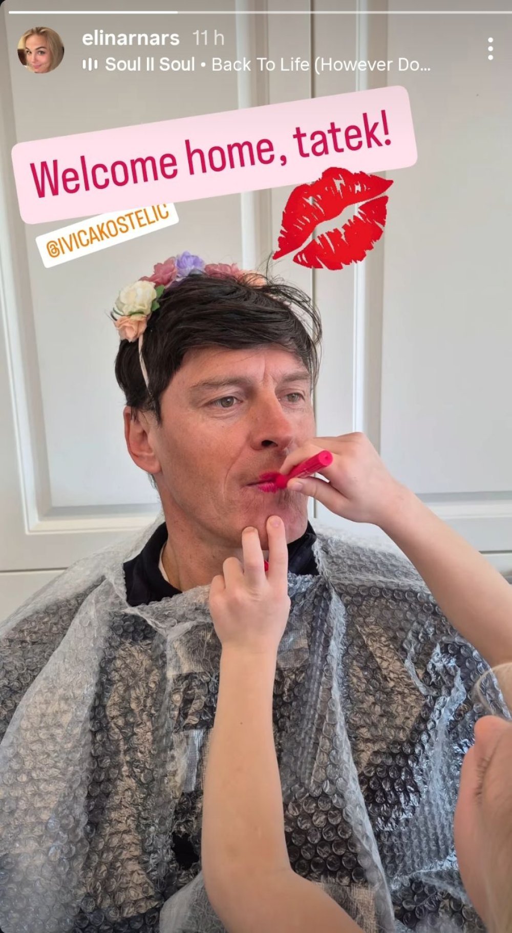 U obitelji Kostelić i ovaj je put glavnu ulogu preuzeo jedan mali, spontani trenutak iz svakodnevice. Elin Kostelić na Instagram Storyju objavila je simpatičan kadar na kojem njihova djeca 'sređuju' Ivicu Kostelića, šminkaju ga crvenim ružem i stavljaju mu rajf s cvijećem, dok je cijela objava zaokružena toplom porukom 'Dobrodošao kući, tatek'.