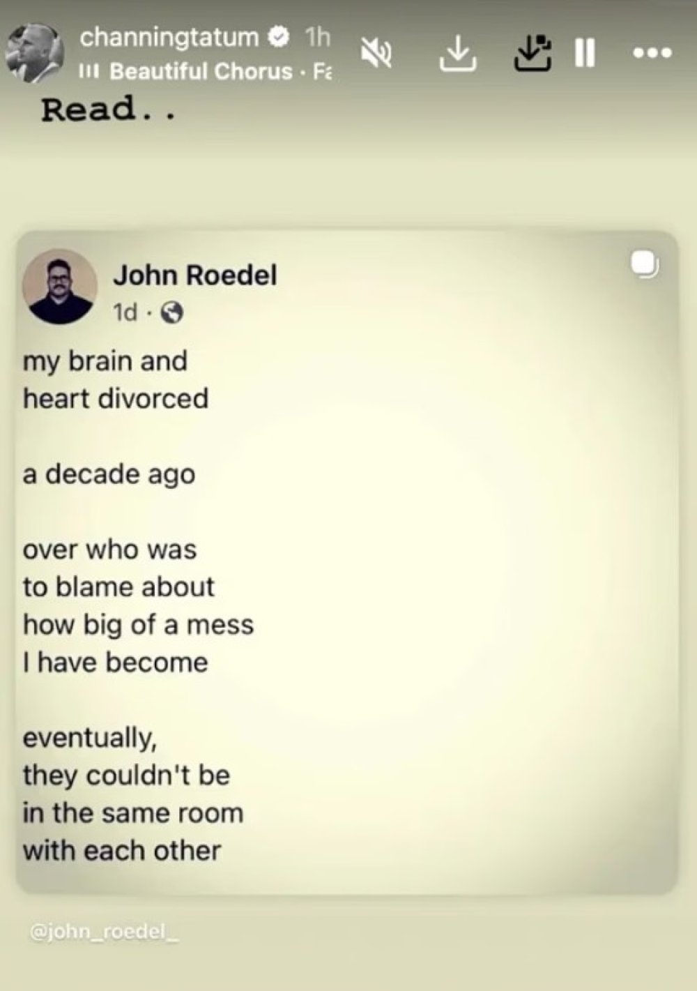 Channing Tatum ponovno je privukao veliku pozornost obožavatelja nakon što je na Instagramu podijelio zagonetnu pjesmu Johna Roedela 'My Brain And Heart Divorced', koja govori o tjeskobi, emocionalnom pritisku i osjećaju razdvojenosti između razuma i srca.