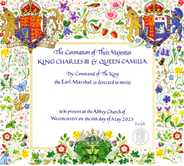 Osim toga, na pozivnici se nalazi i slovo C na kojemu se nalaze dvije ptičice. Slovo C predstavlja Charlesa i Camillu, a okruženo je i njihovim službenim grbovima. Grb kraljice supruge naknadno je ažuriran kako bi odao počast njezinoj tituli kraljevske dame Reda podvezice, koji je dobila prošlog ljeta.