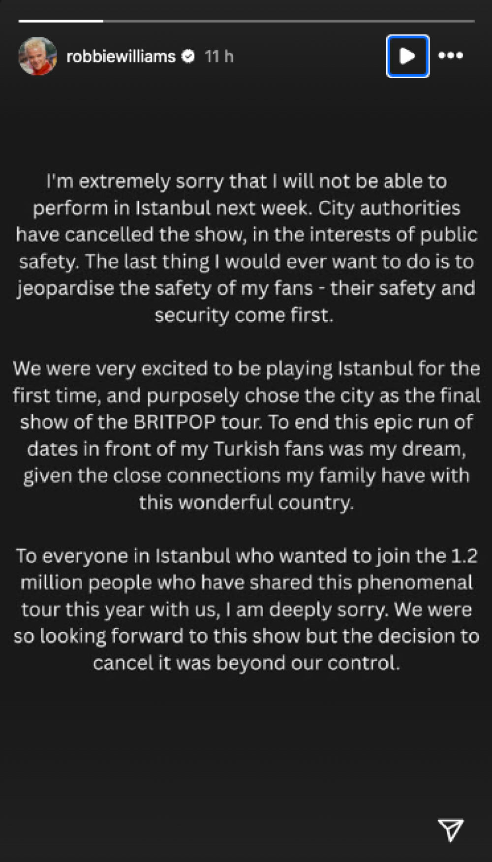 Pjevač je naglasio i osobnu povezanost s Turskom, podsjetivši na obiteljske veze s tom zemljom, te se ispričao svima koji su željeli biti dio, kako kaže, 1,2 milijuna ljudi koji su ove godine bili s njim na fenomenalnoj turneji. 'Silno smo se veselili ovom koncertu, ali odluka o otkazivanju bila je izvan naše kontrole', poručio je.