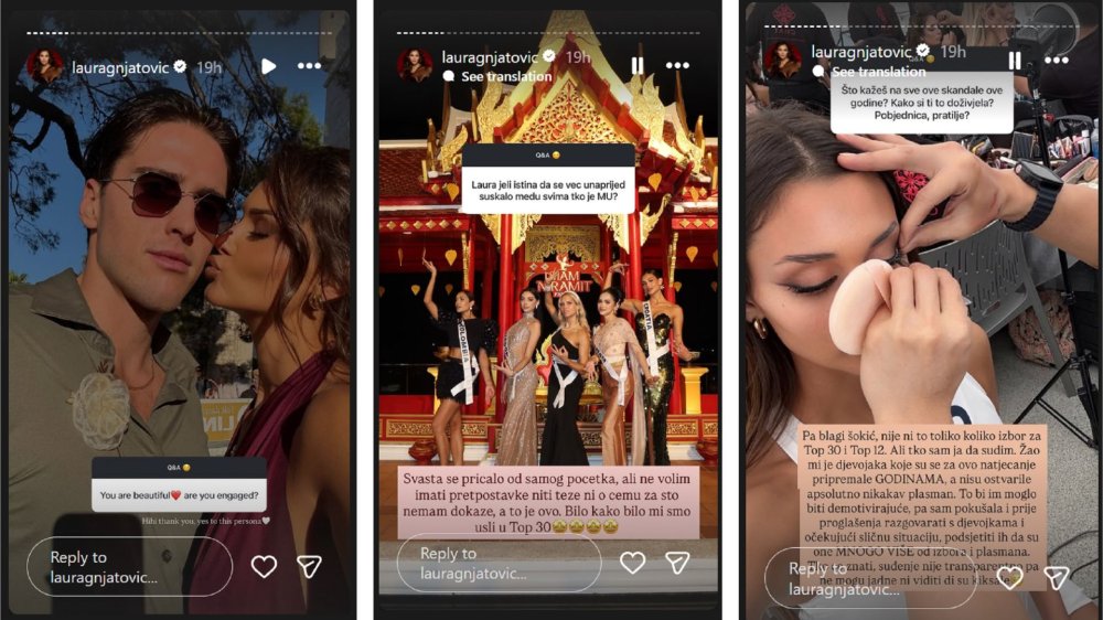 Zadranka Laura Gnjatović osvojila je svjetsku javnost te bila jedna od favoritkinja na izboru za Miss Universe koji se održao na Tajlandu. Dok čeka povratak u Hrvatsku pratitelje zabavlja objavama, a rado je podijelila neke nepoznate informacije kroz popularne 'Q&A'. Riječ je o formi kojom se poznati služe kako bi svojim fanovima omogućili da im postave pitanja koja ih zanimaju