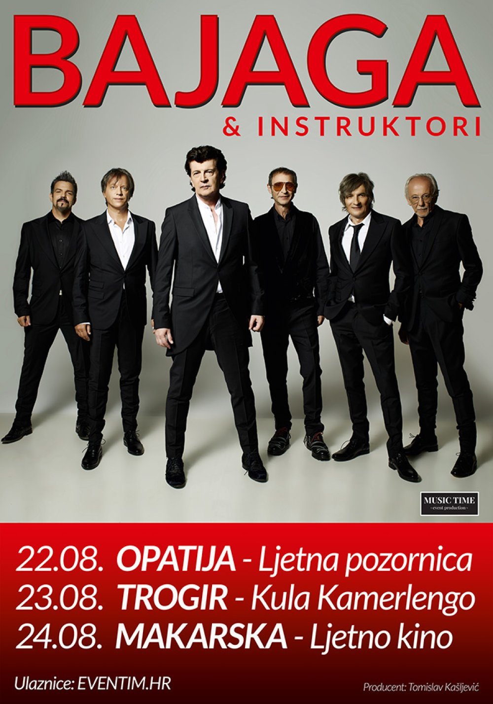 Poslušajte legendarne hitove Bajage i Instruktora uživo! Ulaznice za sve koncerte možete kupiti putem sustava Eventim. Ulaznice za koncert u Opatiji možete kupiti putem sustava Mojekarte, za koncert u Trogiru preko sustava Croatia Tickets te u Turističkoj zajednici grada Trogira i za koncert u Makarskoj preko sustava Croatia Tickets te u agenciji Marivaturist.